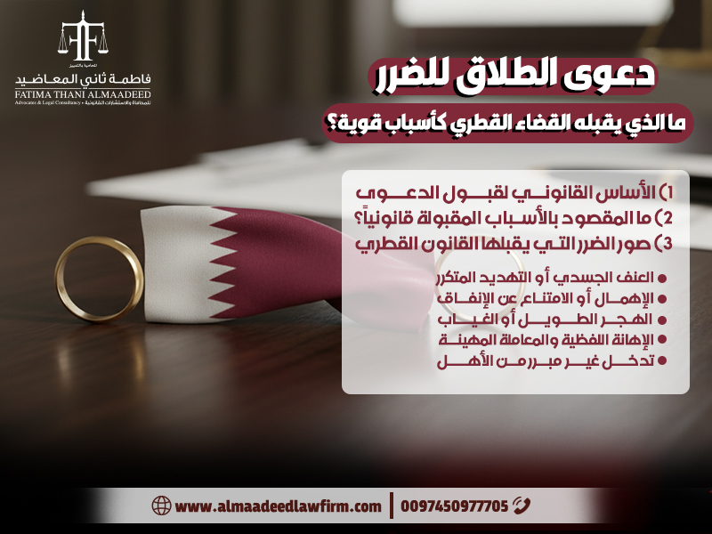 في ظل التطورات القانونية والاجتماعية المتسارعة التي تشهدها دولة قطر. يقدم مكتب فاطمة ثاني المعاضيد للمحاماة والاستشارات القانونية (almaadeedlawfirm) خدمات متميّزة في مجال القضايا الأسرية، لاسيما ما يتعلق بـ دعوى الطلاق للضرر في قطر. وبناءً عليه، تتناول هذه المقالة تحليل أسباب قبول دعوى الطلاق للضرر أمام القضاء القطري ضمن إطار قانون الأسرة القطري رقم 22 […]